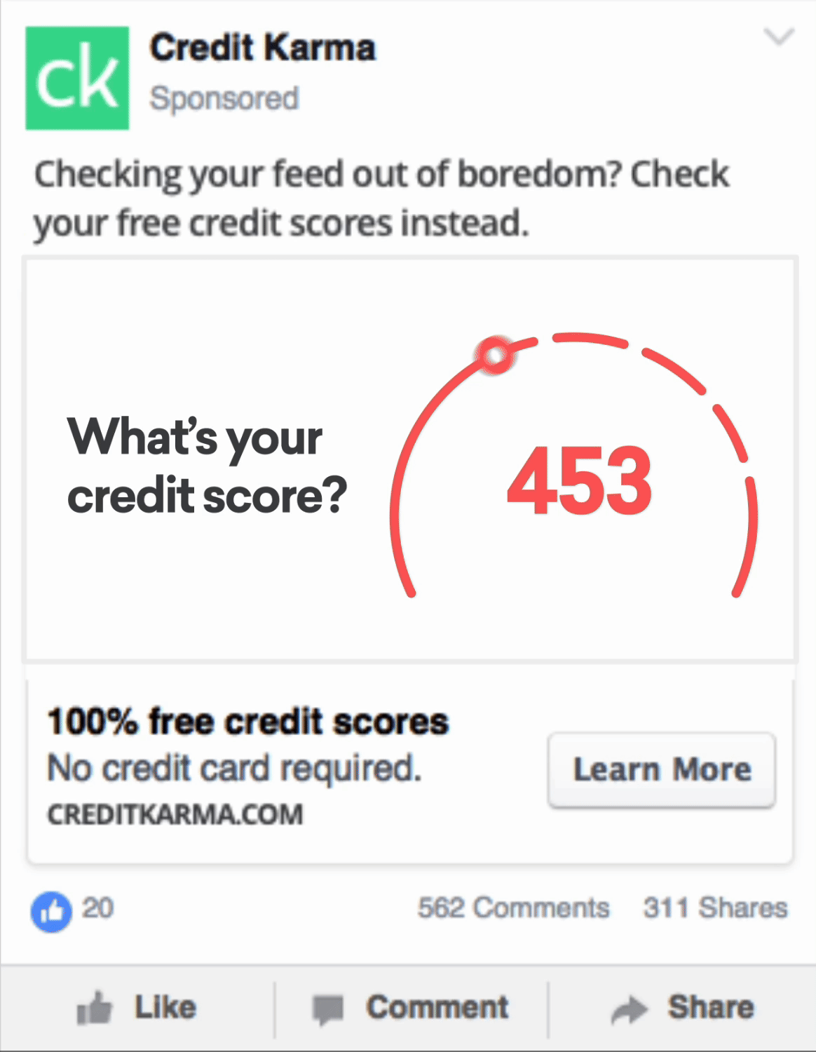 Most people join Credit Karma simply because they’re curious about their credit score. So I cut to the chase with this straightforward ad that promises to give audiences exactly what they want. The campaign outperformed a control ad that hadn’t been beaten in years.