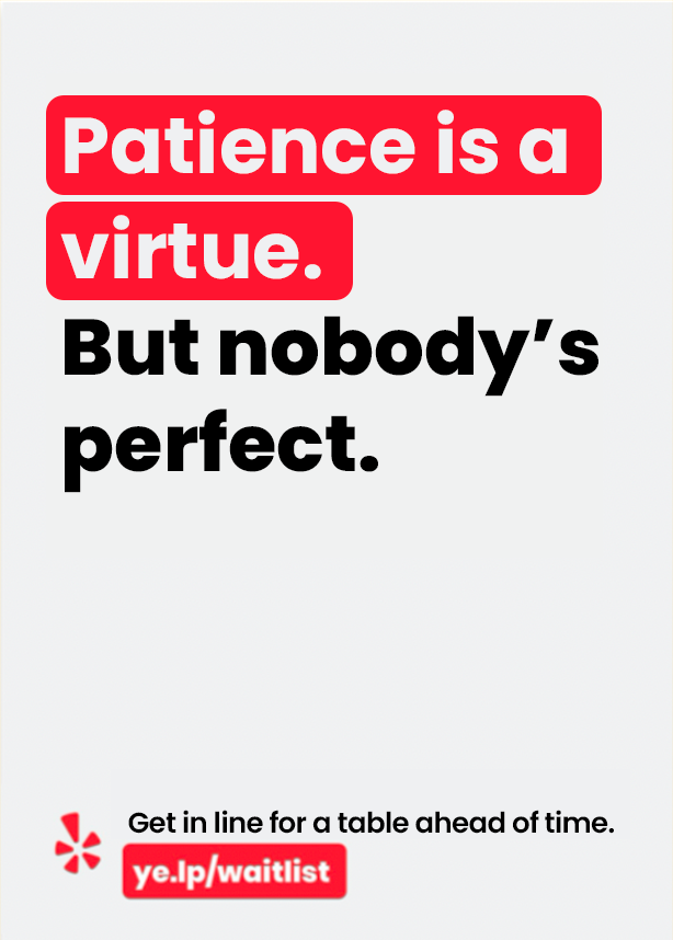 This campaign raised awareness for Yelp’s Waitlist feature precisely at the time when diners would most appreciate it—while they’re hungry and waiting for a table. We grabbed their attention with amusing, thought-provoking headlines that validated their feelings in the moment, and then we let them know that there’s a better way to get a table.