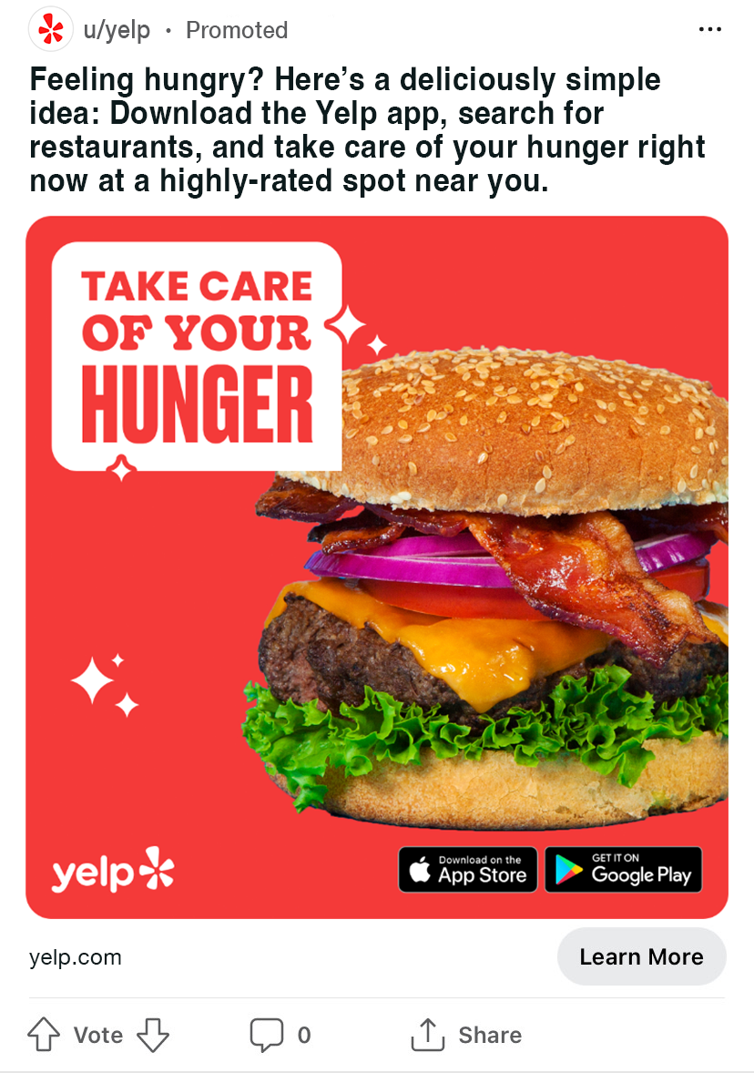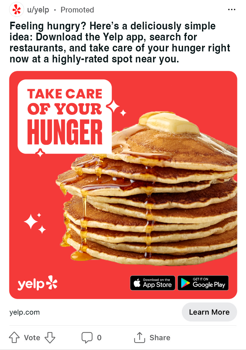 Scrolling on an empty stomach? It’s easy to lose track of time, and even ourselves, while we’re scrolling endlessly through Reddit. We might not even realize we’re getting hungry. Yelp helps you find the absolute best food nearby, so you can take care of your hunger and yourself.